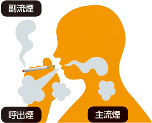 他人の喫煙によりたばこから発生した煙(副流煙(ふくりゅうえん)・呼出煙(こしゅつえん))にさらされる受動喫煙は、肺がんや乳幼児突然死症候群、虚血性心疾患等のリスクを高めるとされています。また、年間死亡者数は、約1万5千人、受動喫煙のある人は、ない人に比べ、肺がんリスクが約1.3倍になると言われています。
