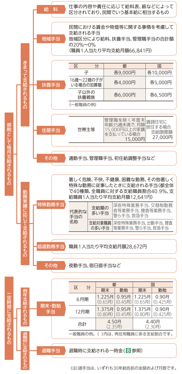 (2)職員手当のうち主なものは、扶養手当135億円、地域手当1,214億円、通勤手当207億円、超過勤務手当521億円などです。