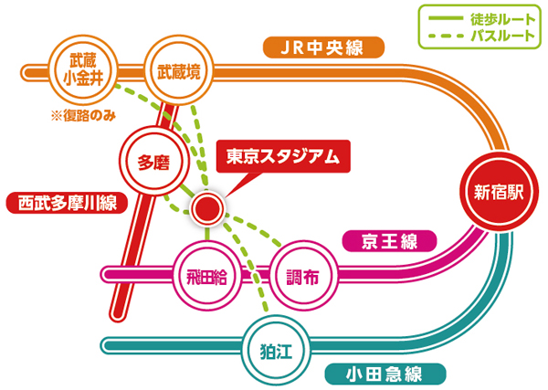 特に9月20日(金曜日)・11月1日(金曜日)は来場者混雑と帰宅ラッシュの時間が重なり東京スタジアム(飛田給駅)周辺は、大変混雑することが予想されますので、混雑予想時間を避けてのご利用にご協力お願いします。