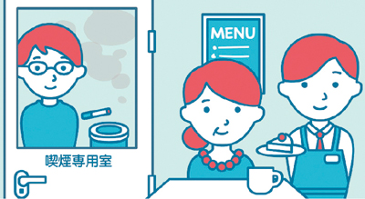 令和2年4月1日に全面施行された「健康増進法」と「東京都受動喫煙防止条例」により、屋内は原則禁煙です。また、喫煙可能な場所(屋内屋外とも)であっても、たばこを吸う時には周囲に配慮する義務があります。