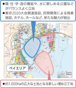 臨海副都心や新たな埋め立て地などの東京ベイエリアが持つポテンシャルを生かし、デジタル時代においても「ここにしかない」魅力を求めて人々が集まる、「自然」と「便利」が融合した都市モデルを実現します。