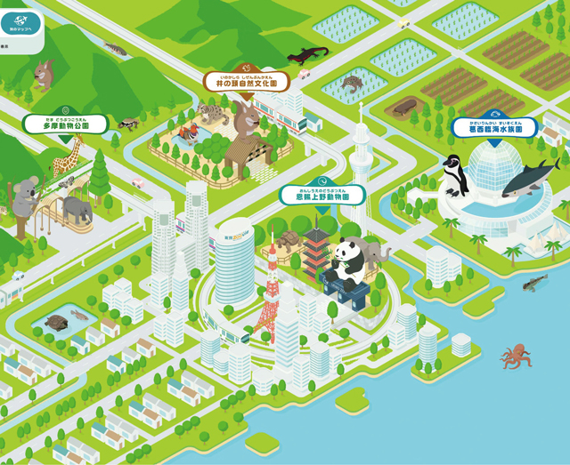入口となる東京マップ、恩賜上野動物園・多摩動物公園・葛西臨海水族園・井の頭自然文化園の園内マップ、さらに生き物たちの生息地が分かる日本マップ・世界マップから好きなマップを選んで探索できます。マップ上で生き物を選択すると、生態や暮らしている環境などの詳しい情報を知ることができます。