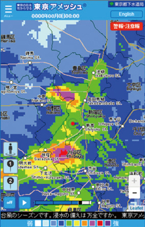 今、都内のどこで雨が降っているのか、雨の強さを10段階に色分けして表示します。発令中の各種警報・注意報も確認できます。