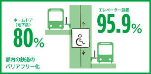 大会に向けて都内のバリアフリー化を進め、鉄道駅ではエレベーター等による段差解消95.9%、地下鉄駅でのホームドア等設置約80%を達成しています。引き続き、質の高いバリアフリー環境整備を推進していきます。