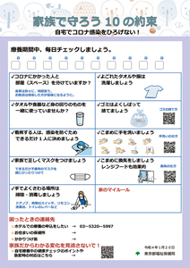 家庭内での感染対策についてまとめた「自宅療養者向けハンドブック」の改訂を行うとともに、自宅療養中の留意点等をまとめたチェックリスト「家族で守ろう10の約束」を作成し、ホームページに掲載