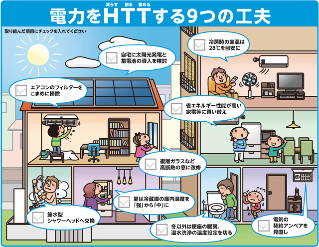 電力をHTT(減らす・創る・蓄める)する取り組みは、気候変動(地球温暖化)対策に寄与するだけでなく、中長期的なエネルギーの安定確保につながります。東京都では都民・事業者の皆さんと一緒にHTTの取り組みを進めていきます。