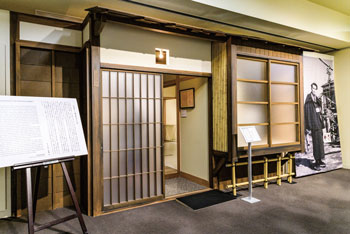 三鷹駅南口からデッキで直結の三鷹市美術ギャラリー内に、2年12月、「太宰治展示室 三鷹の此の小さい家」が開設された。遺族から寄託された資料等を展示・公開するとともに、文献や弟子の回想から、自宅を再現した。書斎兼応接間では、本棚として愛用していたリンゴの木箱や原稿用紙が置かれた文机などに触れることができる。手書きの表札やトレードマークのコート二重廻しが掛けてあるなど細かな部分まで再現されており、じっくりと当時を回想しながら見ることが楽しく、おすすめだ。家族との写真等から太宰の家庭人としての側面をも垣間見ることができるだろう。