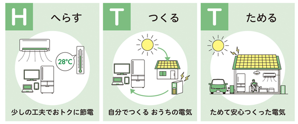 HTTとは5月号「東京の環境問題の現在地」でも取り上げた電力を「(H)へらす(T)つくる(T)ためる」取り組みです。温暖化対策だけではなく、エネルギーの安定確保、そして、暑い夏をおトクで快適に過ごしていくことにもつながっていきます。そんなHTTについて、学んでいきましょう。
