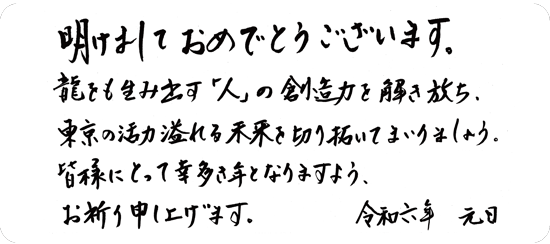 トップページ > 都政情報 > 広報 >WEB広報東京都 > バックナンバー > 2024年 > 広報東京都2024年1月号 > 小池知事 新年ごあいさつ