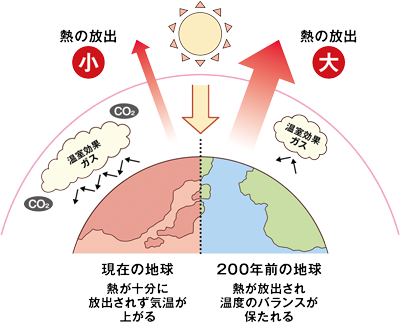 私たち人間の活動などによって排出される「温室効果ガス」のうち、約4分の3にあたるのが二酸化炭素(CO2)。石炭、石油、天然ガスといった「化石燃料」を燃やすことで発生します。