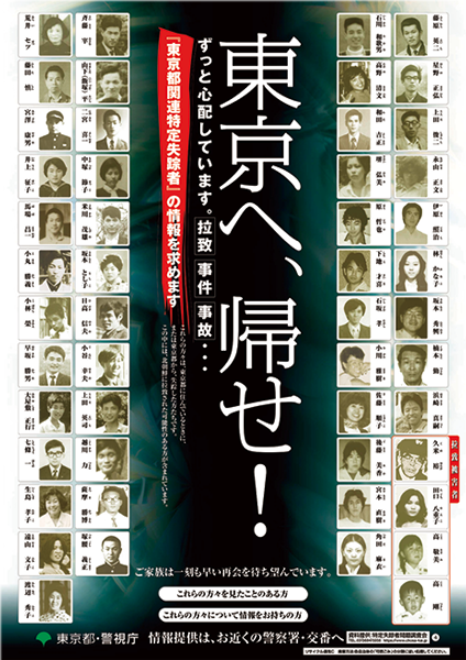 日本政府が認定した17人の拉致被害者の他にも、特定失踪者など、拉致の可能性を排除できない方々が多数存在します。東京都関連では、拉致被害者4人を含む、少なくとも50人の消息がいまだにつかめていません。