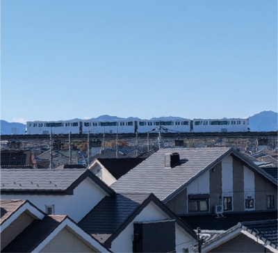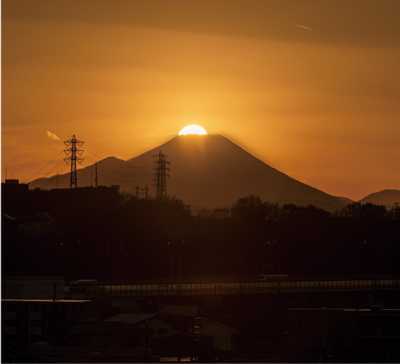 富士山の山頂部と太陽が重なり、まるでダイヤモンドのように輝くことから「ダイヤモンド富士」と呼ばれています。この区間では、ホームから富士山を見ることができます。