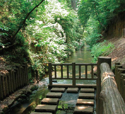 玉川上水のすぐそばまで下りられるように作られた橋。緑が生い茂るなかで清流を身近に感じることができ、自然観察や散策を楽しめます。
