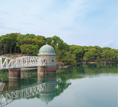 多摩湖にあるドーム屋根とレンガ造りの壁が特徴の取水塔。多摩湖はその美しさから「ダム湖百選」に選ばれており、澄み切った湖と取水塔、奥多摩の豊かな自然は絶景です。