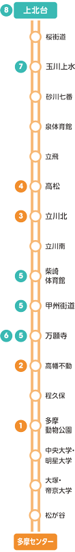 多摩都市モノレールは多摩センター駅を起点とし、終点の上北台駅まで多摩地域を縦断する約16キロメートルの路線。