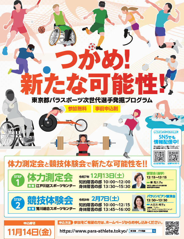 (1)体力測定会:12月13日、江戸川区スポーツセンター(2)競技体験会:2月7日荒川総合スポーツセンターで。