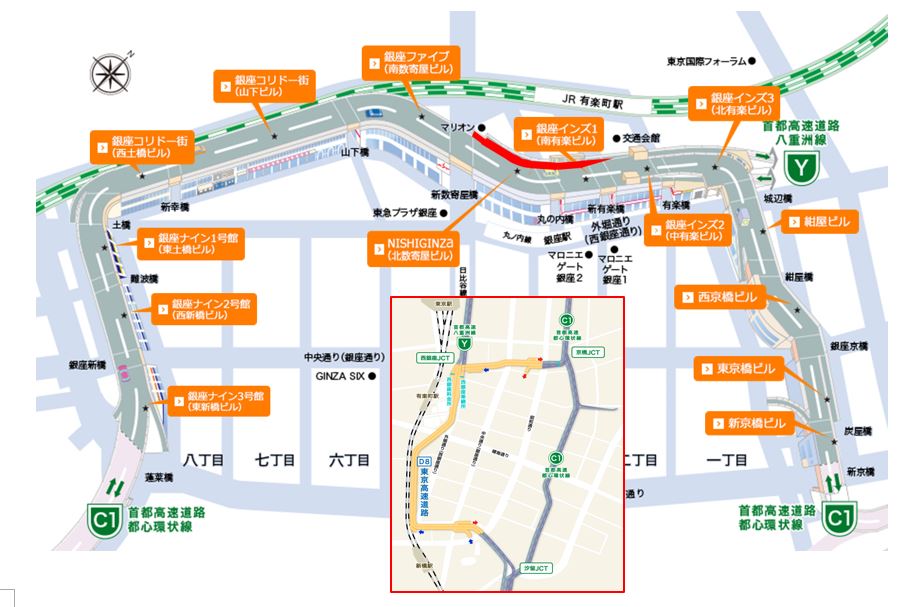 首都高と接続しており、交通量は一日約3万台で、道路建設費と運営費をビル賃貸収益で回収しているため、通行料が無料の高速道路です。銀座一丁目から八丁目にわたる全長約2キロメートル、およそ10万平方メートルの高架下スペースには、400余の店舗、オフィス、駐車場などがあります。