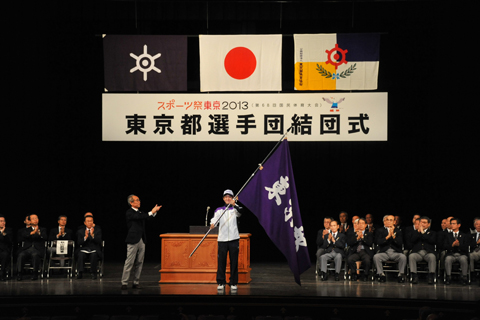 Prior to the commencement of Sports Festival in Tokyo 2013 (68th National Sports Festival), a rally was held for Tokyo’s delegation of athletes at Hibiya Public Hall on August 31. The delegation’s flag was presented to basketball player Takeshi Shingo, and competitive swimmer Kanako Watanabe spoke on behalf of the entire delegation, expressing each athlete’s determination to perform well in their respective sport.