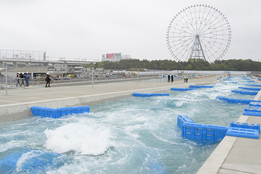 Inspection of the Kasai Canoe Slalom Centre construction site (testing of water flow by pumping water into the course)
