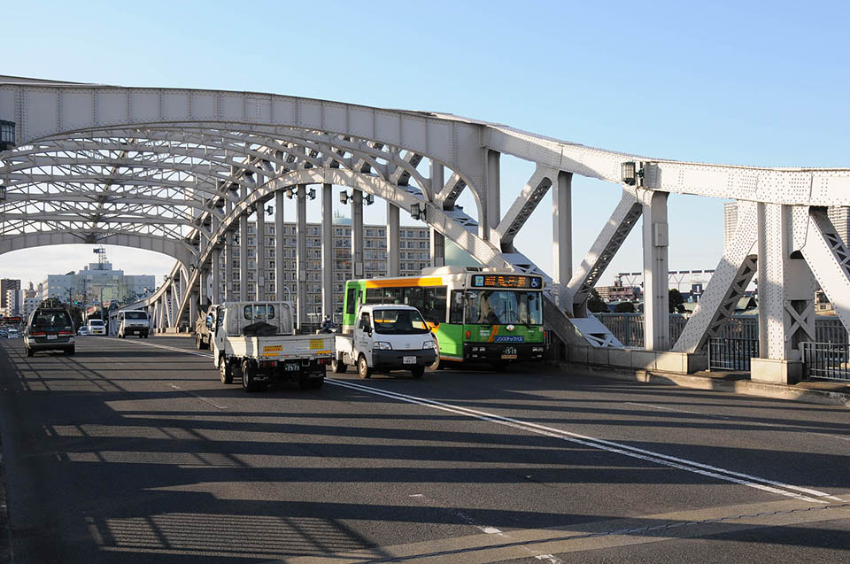 The shape of the bridge is the same as it was constructed in 1931. At the time, trolley buses that take electricity from overhead cables ran along the tracks leading to Kameido Station.