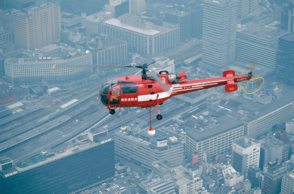 Tokyo Fire Department helicopter overflying Tokyo Station, 05/1987