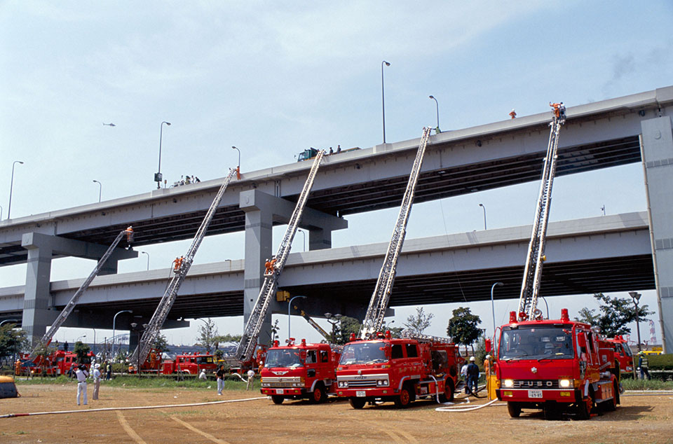 Disaster prevention training on the Metropolitan Expressway (Rinkai-cho, Edogawa Ward), 09/1990