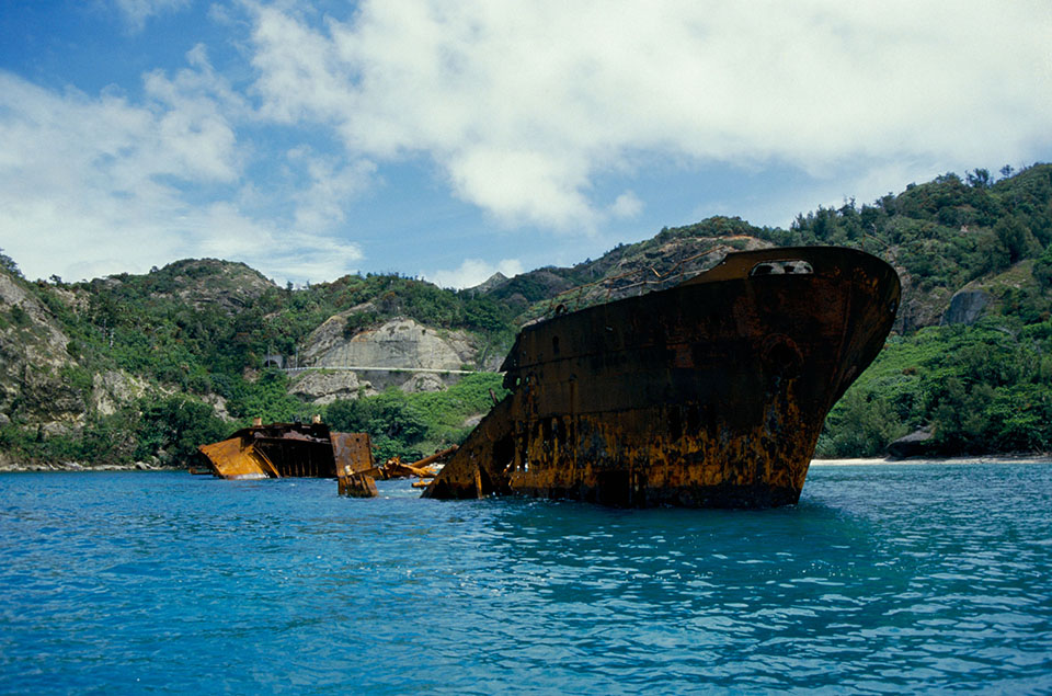 Wrecks of a cargo ship from World War II remaining on Sakaiura, Chichijima, 07/1987
