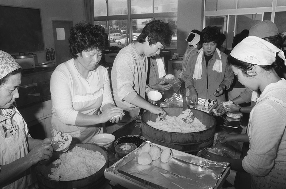 Miyakejima volcanic eruption disaster emergency kitchen (Miyake Elementary School, Miyake Village), 10/1983
