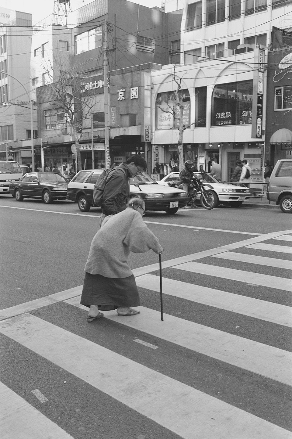 Young person holding an elderly by the hand (Shinjuku Ward), 02/1991