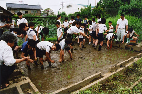 元気な子どもたちの声が6メートル四方程の田んぼに響き渡る。ここは中野区立武蔵台小学校、6月13日梅雨空の下、田植えが始まった。この学校では、7年前から農業体験学習のひとつとして稲の栽培を行っている。参加した5年生76人は、以前から親交のある農家の指導のもと、泥んこになりながら約1時間かけて苗を植え終えた。