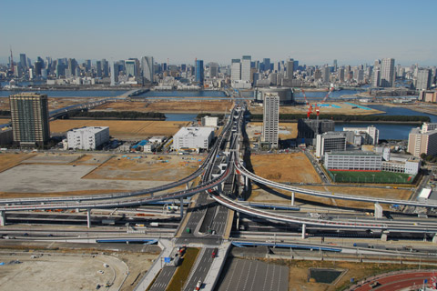 2月11日に開通した東雲ジャンクション(首都高10号晴海線・豊洲出入口)。手前の立体交差下を平行に走るのは首都高速道路湾岸線。前方は銀座方面、左端に東京タワーが見える。この開通により、横浜、千葉方面からの車は渋滞しやすい浜崎橋、箱崎、江戸橋ジャンクションを避けここから直接都心に入れるようになる。(2009年2月18日撮影)