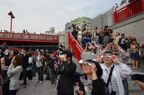 5月21日、東京では173年ぶりとなる金環日食を観測することができた。台東区の吾妻橋では、朝早い時間から、翌日開業するスカイツリーとともに金環日食を観察しようと、多くの人々が集まり、雲の切れ間から覗く約5分間の天体ショーを楽しんでいた。