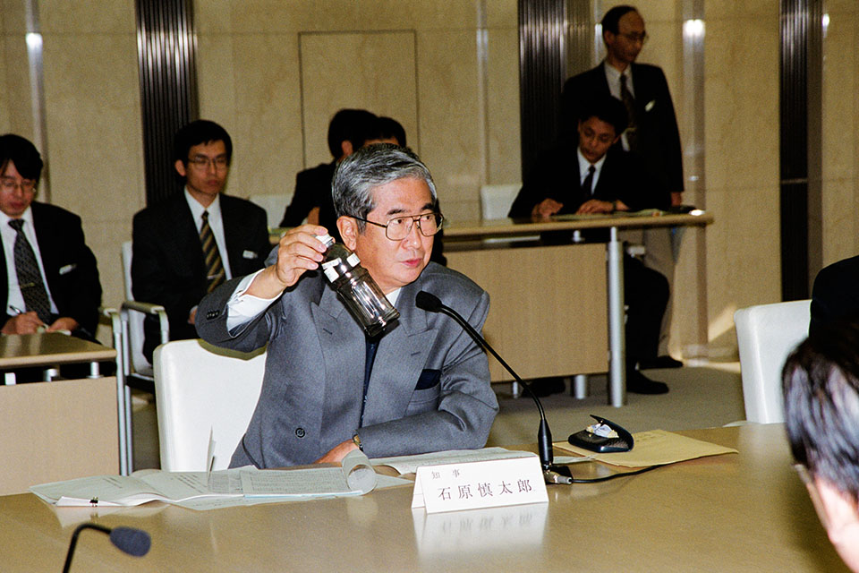 ディーゼル車メーカーの代表を集め、石原知事は車から排出されるススが詰まったペットボトルを手に排ガス規制を訴えた。