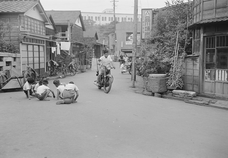新宿区若葉町。日当たりの良い道路で遊びに熱中する子供たち。当時、道路も立派な遊び場だった。