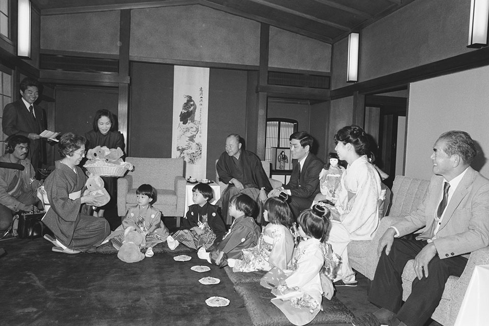 五つ子ちゃん一家が、渋谷区松濤の知事公館に鈴木知事夫妻を訪問。3歳に成長した姿で七五三の報告を行った