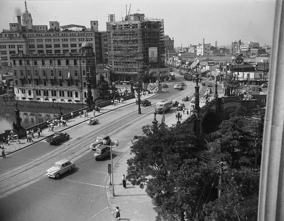 日本の道路網の起点として知られる日本橋。1963(昭和38)年に橋の真上に高速道路が建設され、日本橋の景観は大きく変わった。