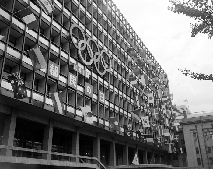 都庁舎には、オリンピックのエンブレムと参加各国の国旗が掲げられた。