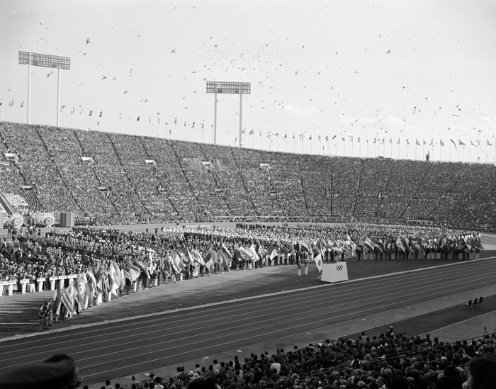 94の国・地域の旗がはためく中、昭和天皇により開会が宣言された。