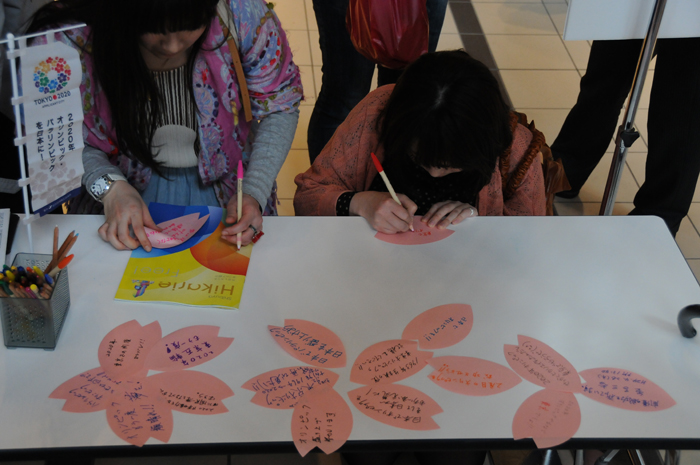 「渋谷ヒカリエ」で開催されたイベントで、ゲストアスリートと共に来場者の皆さんから、桜の花びら形の付箋に招致応援メッセージが寄せられた。