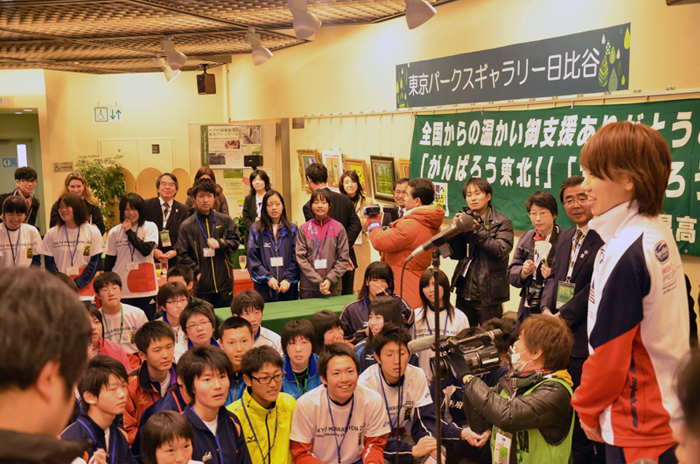 被災地復興支援事業の一環として、東京マラソン2012(10kmの部)に岩手、宮城、福島の高校生105名を招待。フィニッシュ後の交流会では、福島千里選手が高校生を激励した。