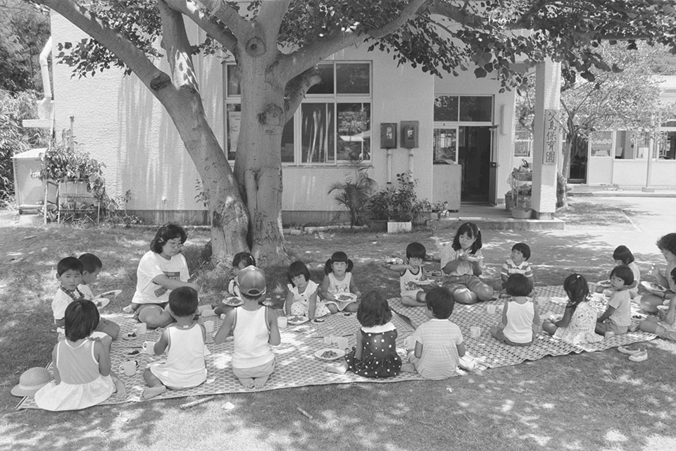 下錆の仮設住宅で元気に遊ぶ子供たち(三宅村)1983年10月