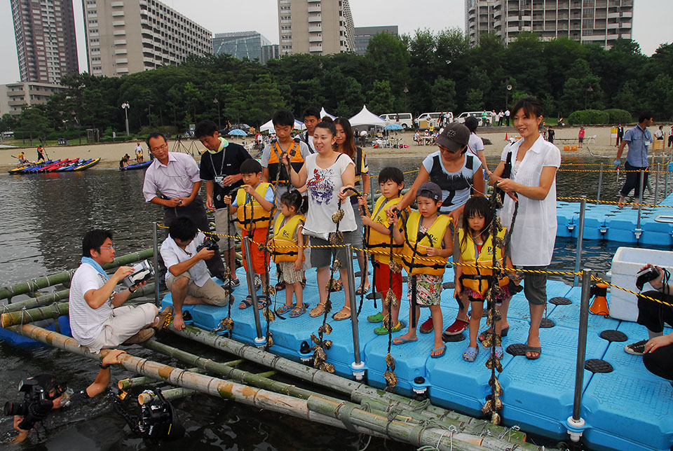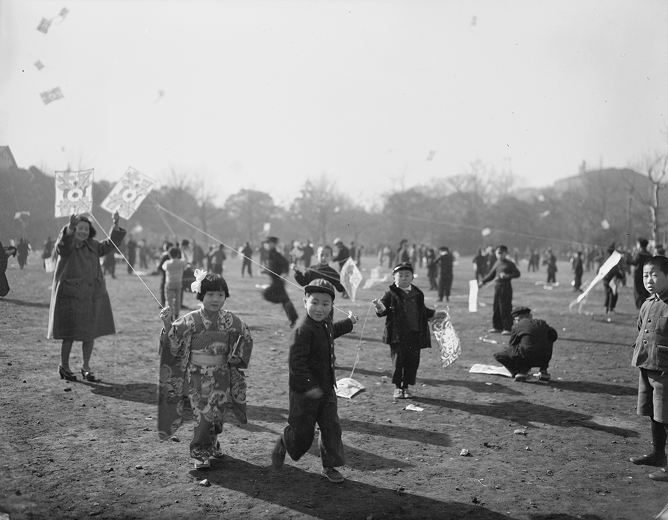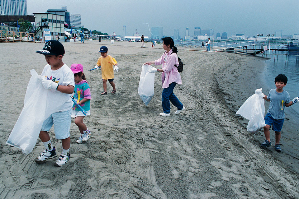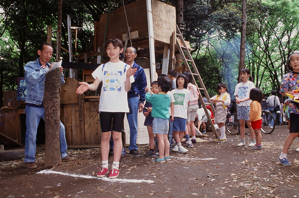 竹とんぼで遊ぶ子供とボランティア(世田谷区)1996年5月