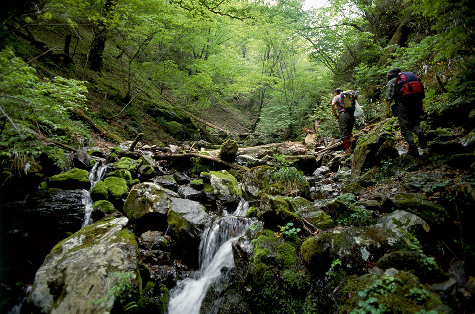 投網でヤマメをとらえる生育調査(奥多摩町) 1995年6月